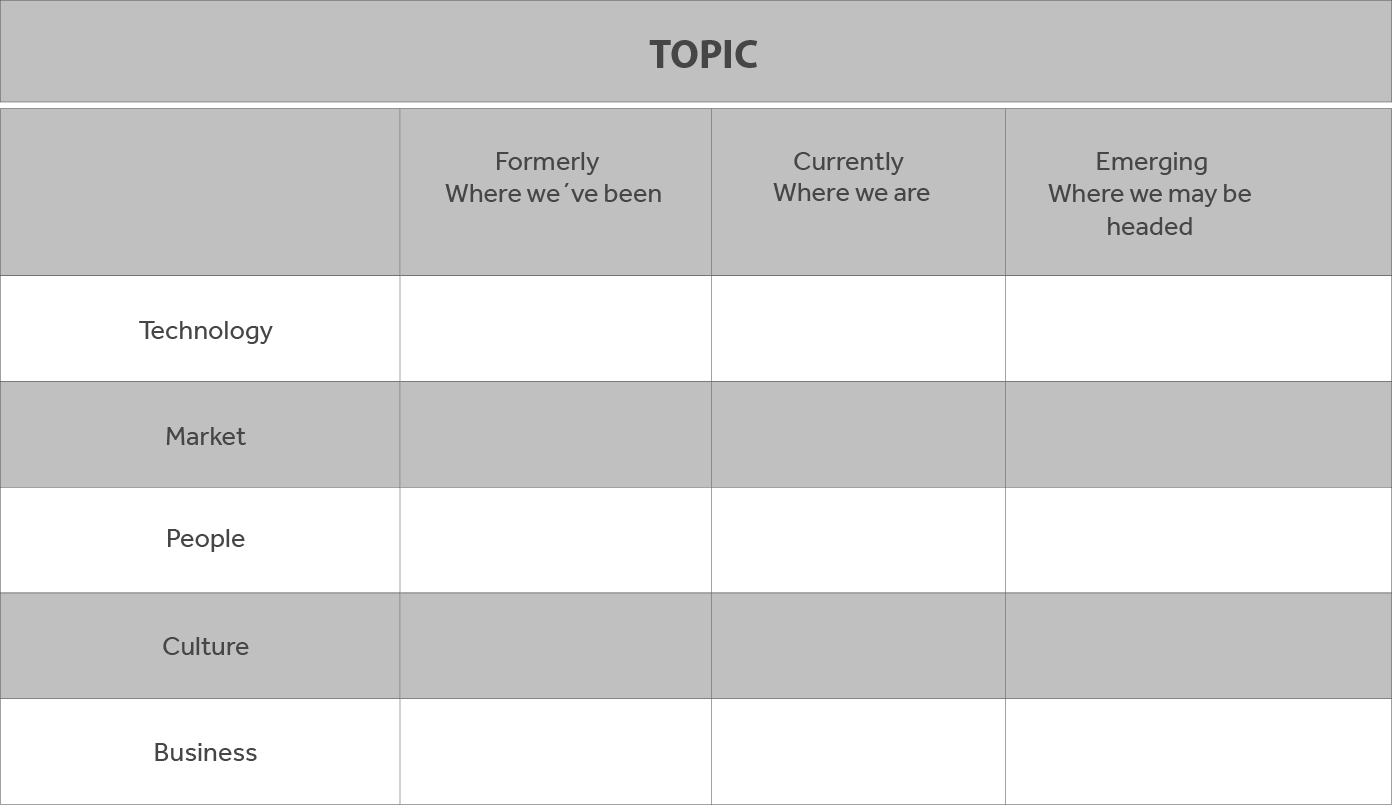 3. Map “Formerly”. Capture where things have been in each category. Focus on what used to be common practice, popular, or standard.